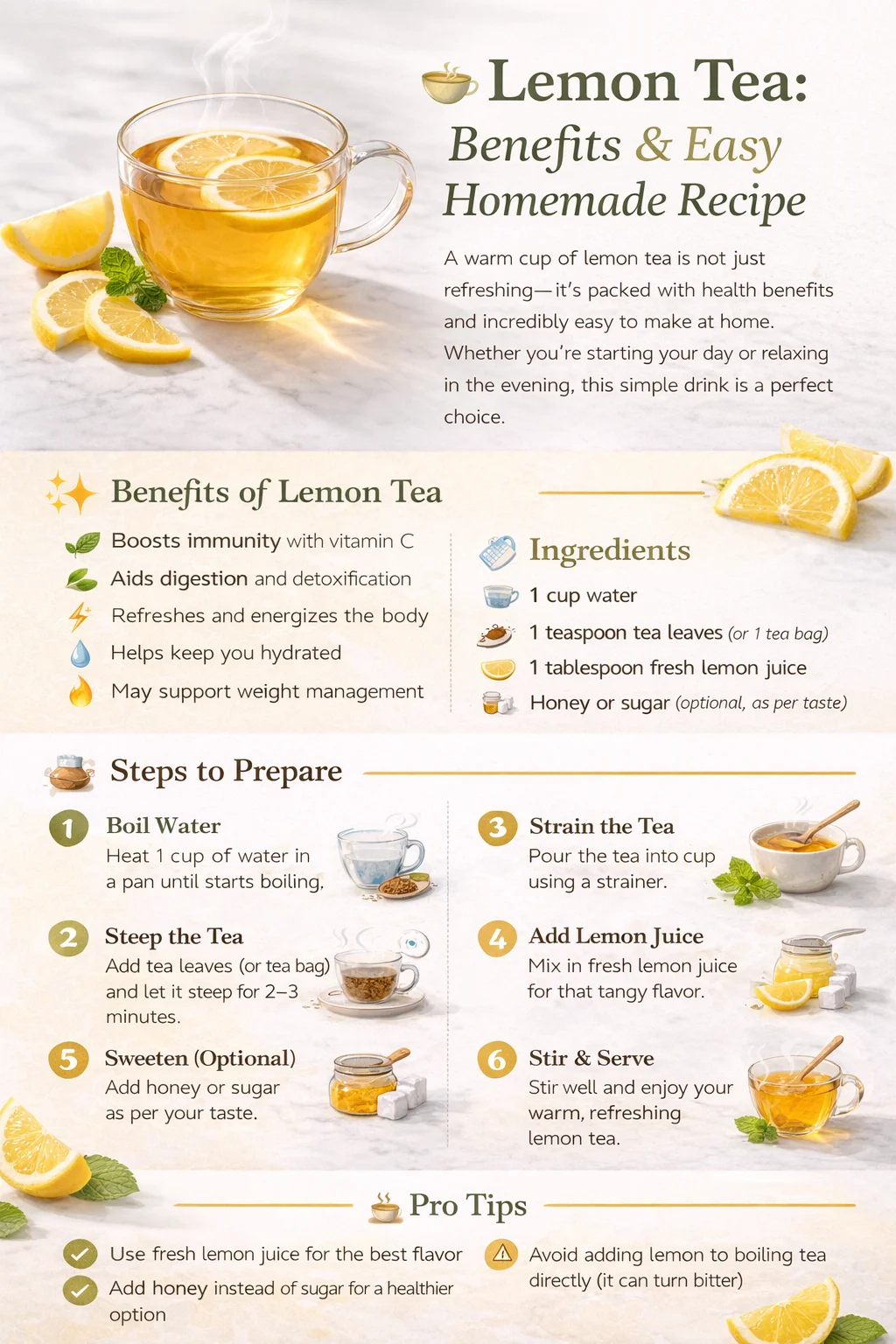 Making lemon tea at home is quick and easy. Here’s a simple recipe you can follow: